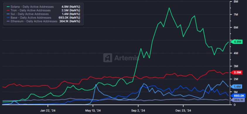 Solana has dominated daily active addresses since August 2024