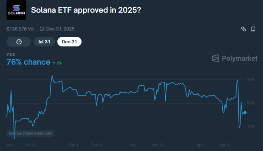 Polymarket, a popular prediction market, gives a Solana ETF approval in 2025 at 76%